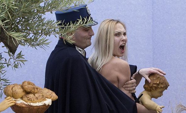 أعلن الفاتيكان إلقاء القبض على ناشطة في جماعة "فيمن" النسائية، بعد أن عرت صدرها، واقتلعت تمثالا للمسيح وهو طفل من مجسم لمشهد الميلاد، أمام آلاف الأشخاص في ساحة القديس بطرس. وقال الموقع الإلكتروني