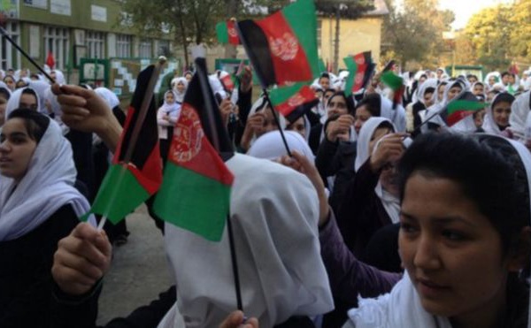 ريتا فايضي فتاة في التاسعة عشرة من عمرها تظهر عليها أمارات الثقة بالنفس تلوح بعلم صغير لأفغانستان يرفرف فوق حشد من الفتيات اللائي يرتدين الحجاب الأبيض في فناء مدرسة زارغونة للفتيات في العاصمة