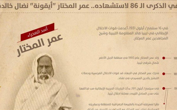 طرابس - قبل 86 عاما ترجل عمر المختار بعد 20 عاما قضاها في قتال المحتل الإيطالي، ليكتب التاريخ العربي والإسلامي اسم البطل الليبي بحروف من نور، ويصبح "شيخ الشهداء" أو "فارس الصحراء" مضرب الأمثال في