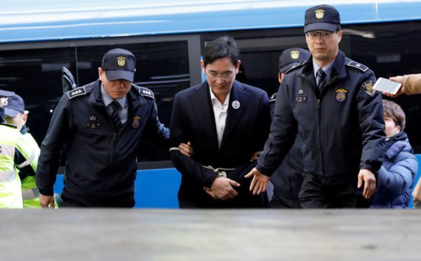 سيول, كوريا الجنوبية - اقتيد وريث مجموعة سامسونغ الضخمة الذي يتولى رئاستها بحكم الامر الواقع، مقيد اليدين وموثقا بحبل السبت الى جلسة استجوابه في مكتب المدعين العامين الخاصين بفضيحة الفساد الواسعة