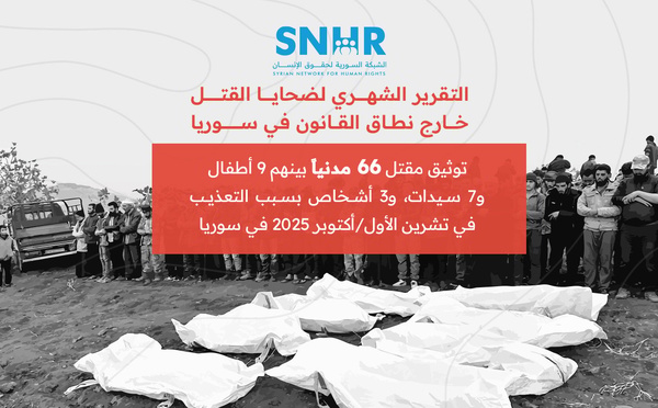 دمشق –قالت الشَّبكة السورية لحقوق الإنسان في تقريرها إنَّ 66 مدنياً قد قتلوا في سوريا في تشرين الأول/ أكتوبر 2025، بينهم 9 أطفال و7 سيدات، و3 بسبب التعذيب. جاء التقرير في 12 صفحة، ورصد فيه حصيلة