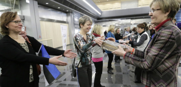 لاتفيا - شكل الآلاف من اللاتفيين سلسلة بشرية رغم البرد القارص لنقل الكتب من مبنى المكتبة الوطنية القديمة إلى مبناها الجديد الواقع على بعد نحو كيلومترين، كجزء من احتفالاتهم بإعلان مدينة ريغا عاصمة