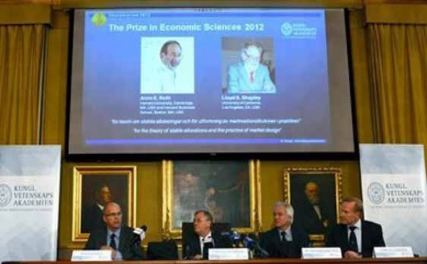 ستوكهولم - اوغ اونوريه - منحت جائزة نوبل للاقتصاد 2012 الاثنين الى الاميركيين ألفن روث ولويد شابلي عن ابحاثهما حول الاسواق والطريقة الافضل للتوفيق بين العرض والطلب مع تطبيقات تشمل وهب الاعضاء