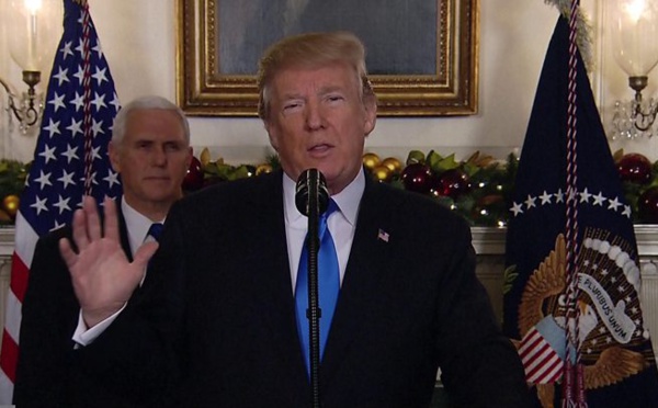 واشنطن - أعلن الرئيس الأمريكي دونالد ترامب اعتراف الإدارة الأمريكية رسميا بمدينة القدس عاصمة لإسرائيل. وأكد ترامب خلال كلمته مساء اليوم بالبيت الأبيض بشأن القدس إن واشنطن ستدعم حل الدولتين إذا اتفق