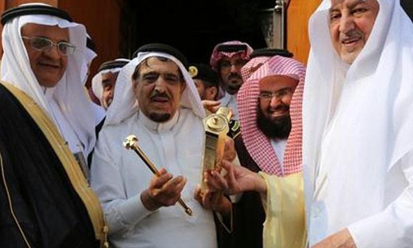 الرياض - تسلم الشيخ عبدالقادر بن طه الشيبي، كبير سدنة الكعبة الذي كان النبي محمد قد أوكل إلى أسرته منذ قرون هذه المهمة، القفل الجديد للكعبة ومفتاحه الخاص، في أعقاب مراسم غسل الموقع المقدس لدى