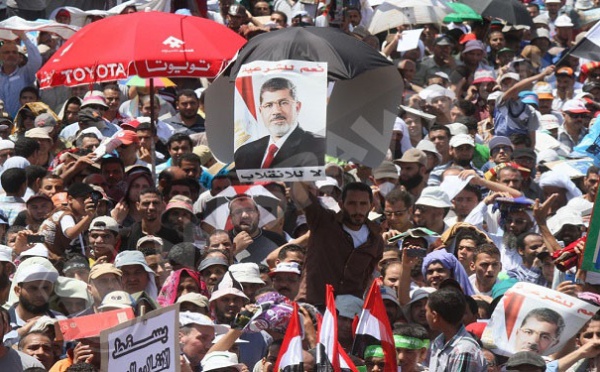 المتظاهرون المؤيدون لمرسي يستعدون لهجوم الشرطة بالعصي واكياس الرمل