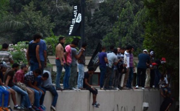 القاهرة - ايناس بلعايبة - نزع متظاهرون مصريون مساء الثلاثاء العلم الاميركي من فوق مقر السفارة الاميركية في وسط القاهرة ورفعوا مكانه علما اسود كتب عليه "لا اله الا الله محمد رسول الله" وذلك احتجاجا