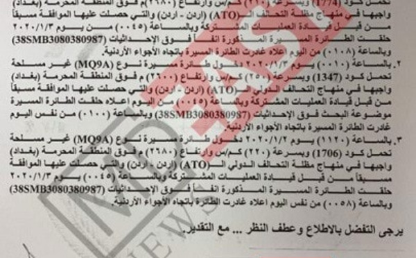 كشفت وثيقة نشرها موقع ”ميدل إيست نيوز“ الإيراني، في وقت متأخر من مساء الجمعة، أن الطائرات المستخدمة في عملية اغتيال قائد فيلق القدس الإيراني الجنرال قاسم سليماني ونائب رئيس هيئة الحشد الشعبي العراقي