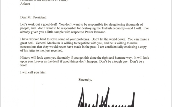 قال مصدر دبلوماسي تركي الخميس إن "الرئيس التركي رجب طيب أردوغان ألقى برسالة نظيره الأمريكي دونالد ترامب بشأن العملية العسكرية في سوريا في سلة القمامة". ونشرت قناة "سي أن أن تورك" خبرا عن المصدر