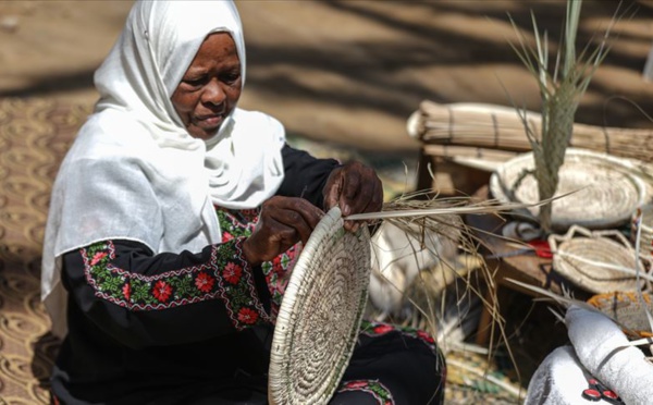 غزة)/ تحت ظلال أشجار النخيل، تجلس حميدة المنايعة (63 عامًا)، ومن حولها أبنائها، محمد (38 عامًا)، وسلمان (30 عاما)، منهمكون في تجهيز العديد من الأطباق والأواني المصنوعة من سعف النخيل، في مهنةٍ يُطلق